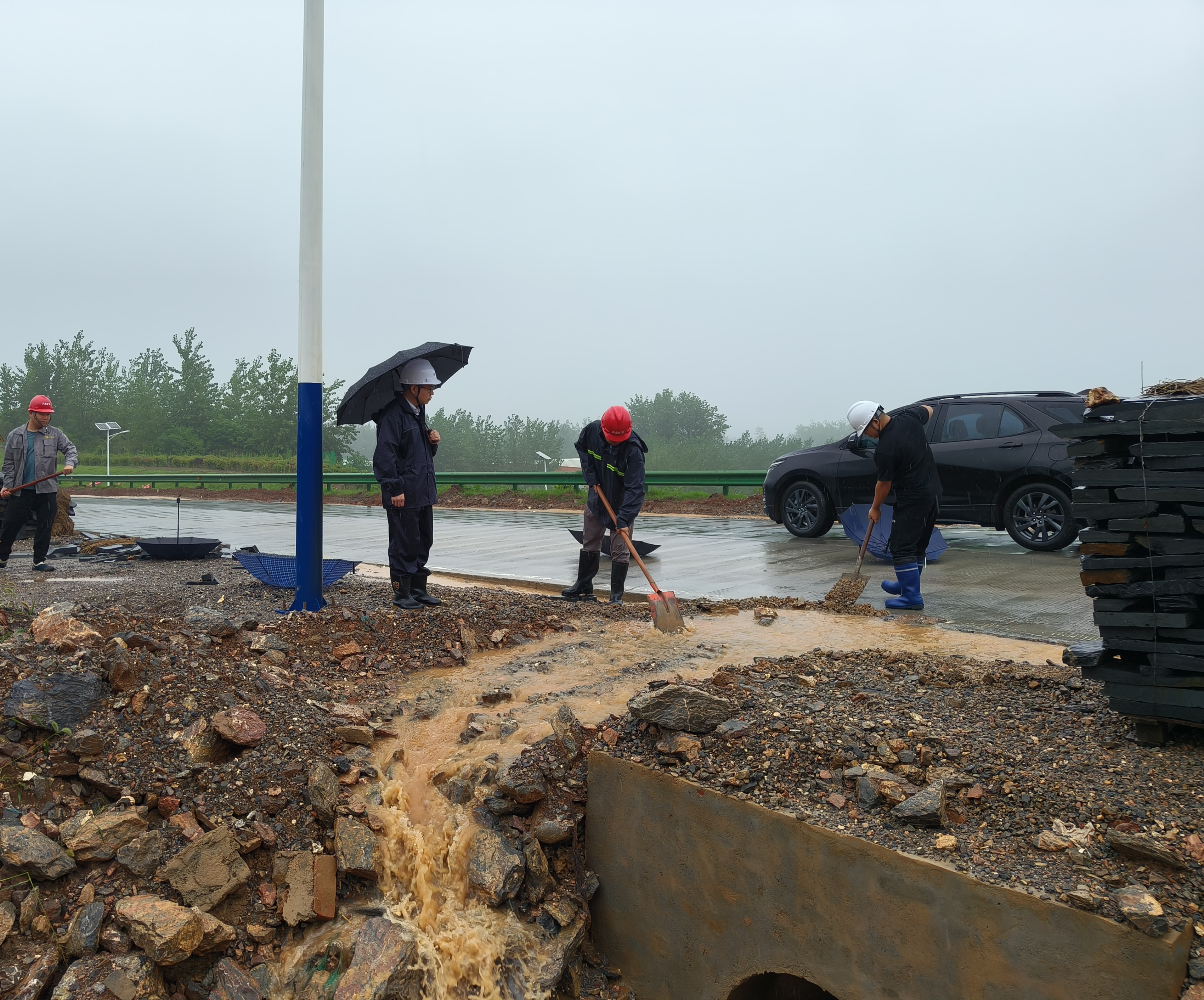 搶險(xiǎn)現(xiàn)場(chǎng),黨員干部帶頭,通過沙包筑堤、開挖排水溝等措施進(jìn)行預(yù)防,同時(shí)對(duì)礦區(qū)、加工區(qū)開展全面隱患排查。中午,水塘漫堤隱患消除。