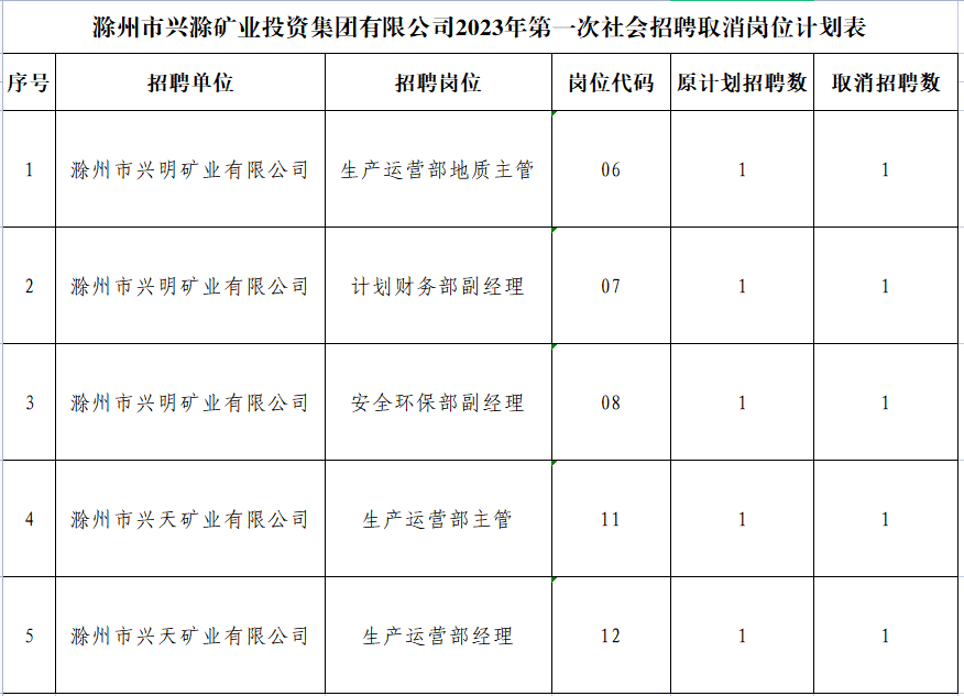 根據(jù)《滁州市興滁礦業(yè)投資集團(tuán)有限公司2023年第一次社會(huì)招聘公告》規(guī)定,經(jīng)對(duì)各崗位報(bào)名情況篩查審定,部分崗位報(bào)名情況未達(dá)到開考比例,經(jīng)研究決定取消以下崗位招聘計(jì)劃: