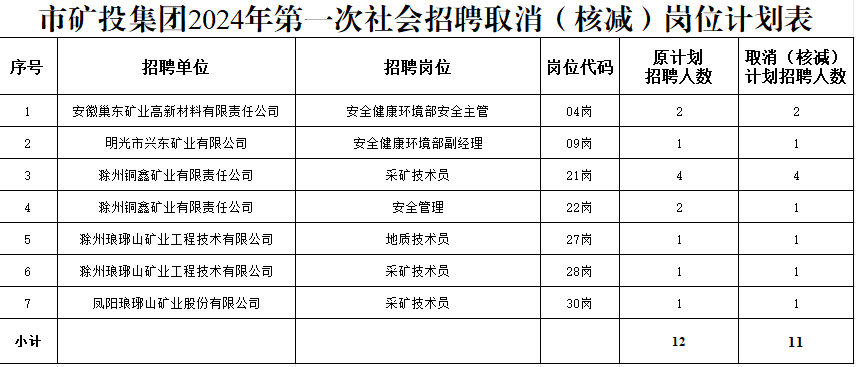 根據(jù)《滁州市興滁礦業(yè)投資集團有限公司2024年第一次社會招聘公告》規(guī)定,經(jīng)對各崗位報名情況篩查審定,結合資格復審情況,部分崗位報名情況未達到開考比例,經(jīng)研究決定取消(核減)以下崗位招聘計劃: